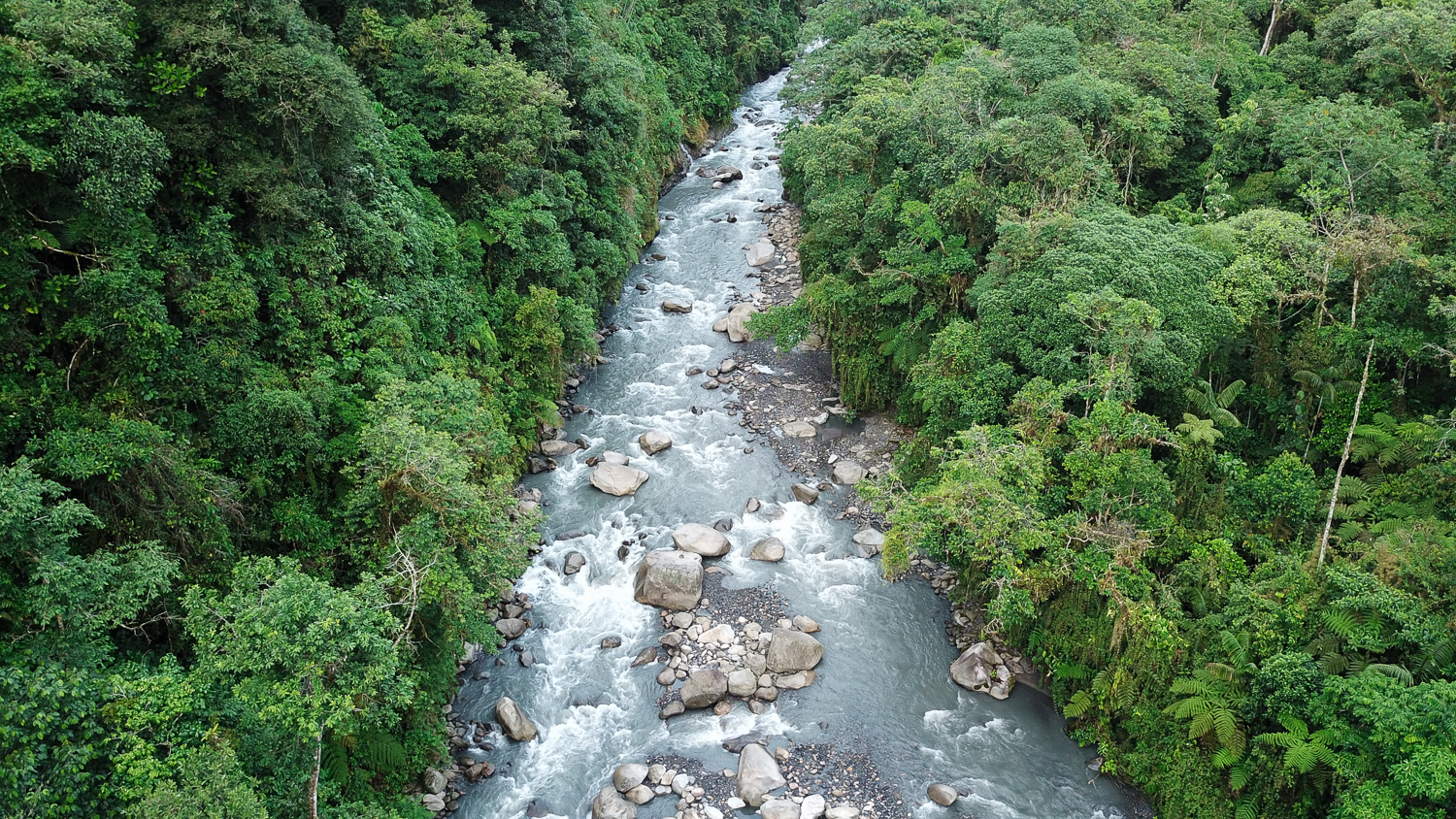 Aerial of river and montane rainforest